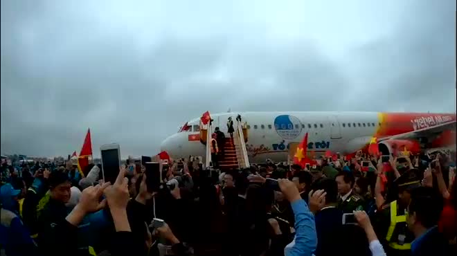 Vừa xuống sân sân bay Nội Bài, các tuyển thủ U23 Việt Nam đã nhận được sự tiếp đón vô cùng nồng nhiệt trong ngập tràn cờ hoa và tiếng hò reo sung sướng của người hâm mộ đã chờ sắn ở đây từ rất sớm.