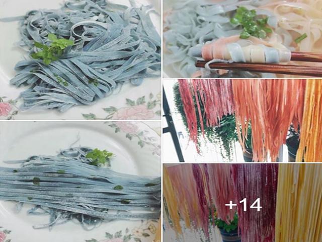Rây mịn 500gr bột mì với 180gr trứng và 50ml dầu ăn, trộn đều sau đó thêm 60ml nước ép rau củ xay, thêm từ từ và nhào đều cho đến khi ráo tay. Nếu quá khô có thể cho thêm nước, tiếp tục nhào trong 20 phút. Sau đó, bọc màng thực phẩm lại, để bột nghỉ 1 tiếng, lôi ra nhào lại 10 phút, rồi bắt đầu cán mỏng, phủ thêm bột ngô hoặc bột năng để sợi mì không bị dính. Màu xanh của bột có thể sử dụng từ màu các loại rau xanh như cải bó xôi.