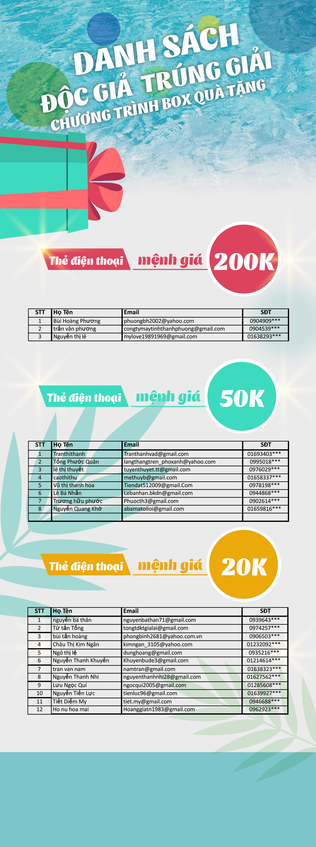 Danh sách độc giải trúng giải chương trình box quà tặng tuần từ 21-28/08/2017