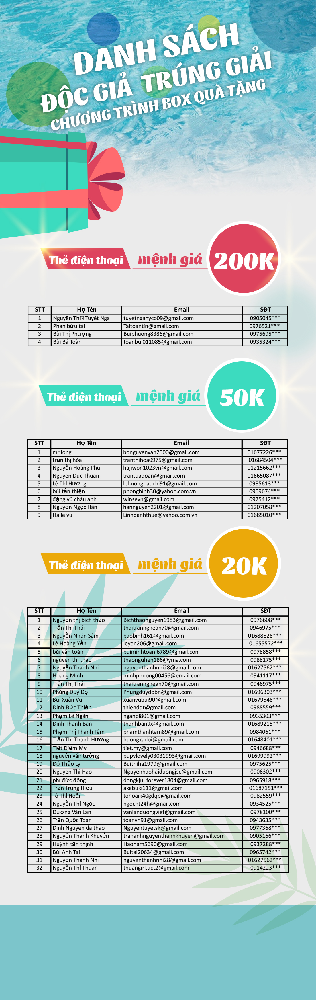 Danh sách trúng thưởng chương trình Box quà tặng từ ngày 14-20 tháng 08