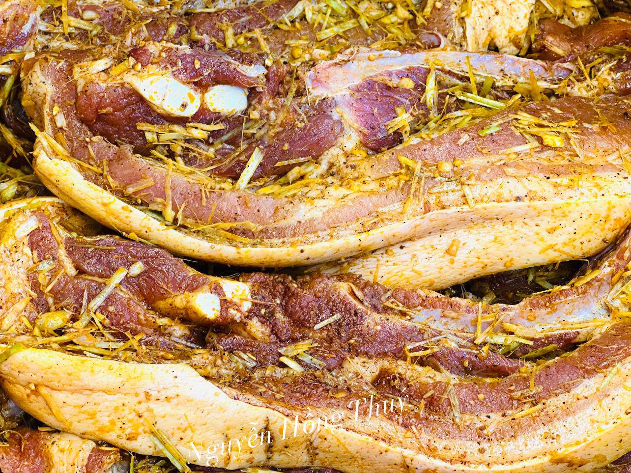 Thịt rửa sạch, chia thành từng miếng rộng khoảng 4-5cm. Xay nhỏ các nguyên liệu: sả, hành, tỏi, hạt dổi, mắc khén, bột canh, hạt tiêu rồi ướp với thịt trong khoảng 1 tiếng. Lưu ý: không nên ướp với nước mắm vì có thể ảnh hưởng đến chất lượng của thịt khi phơi.