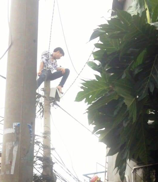 Thanh niên ngồi vắt vẻo trên ngọn trụ điện la hét