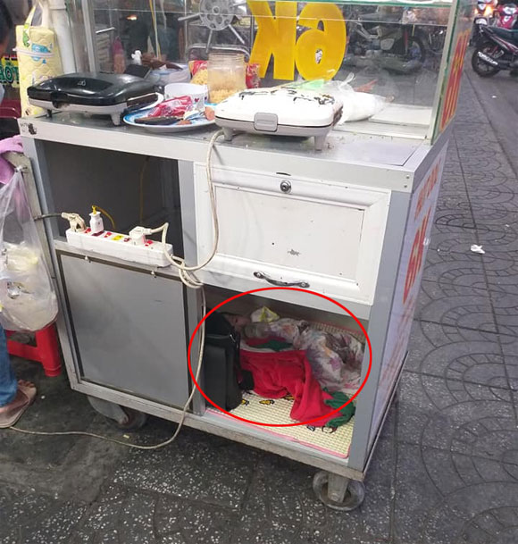 Hình ảnh một em bé chỉ mới vài tháng tuổi nằm dưới tủ xe đẩy bán hàng cùng mẹ đang nhận được rất nhiều chia sẻ, quan tâm của cư dân mạng.