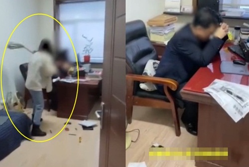 Ông Vương Xuân Huy ôm đầu chịu trận khi bị cấp dưới tấn công bằng cây lau nhà.
