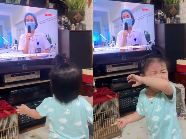 Trong clip, bé gái khóc nức nở, giơ tay về phía màn hình ti vi, nơi mẹ đang mặc áo bác sĩ trả lời phỏng vấn trên truyền hình. Như chủ nhân clip chia sẻ, bé gái liên tục với tay muốn mẹ bế mình.