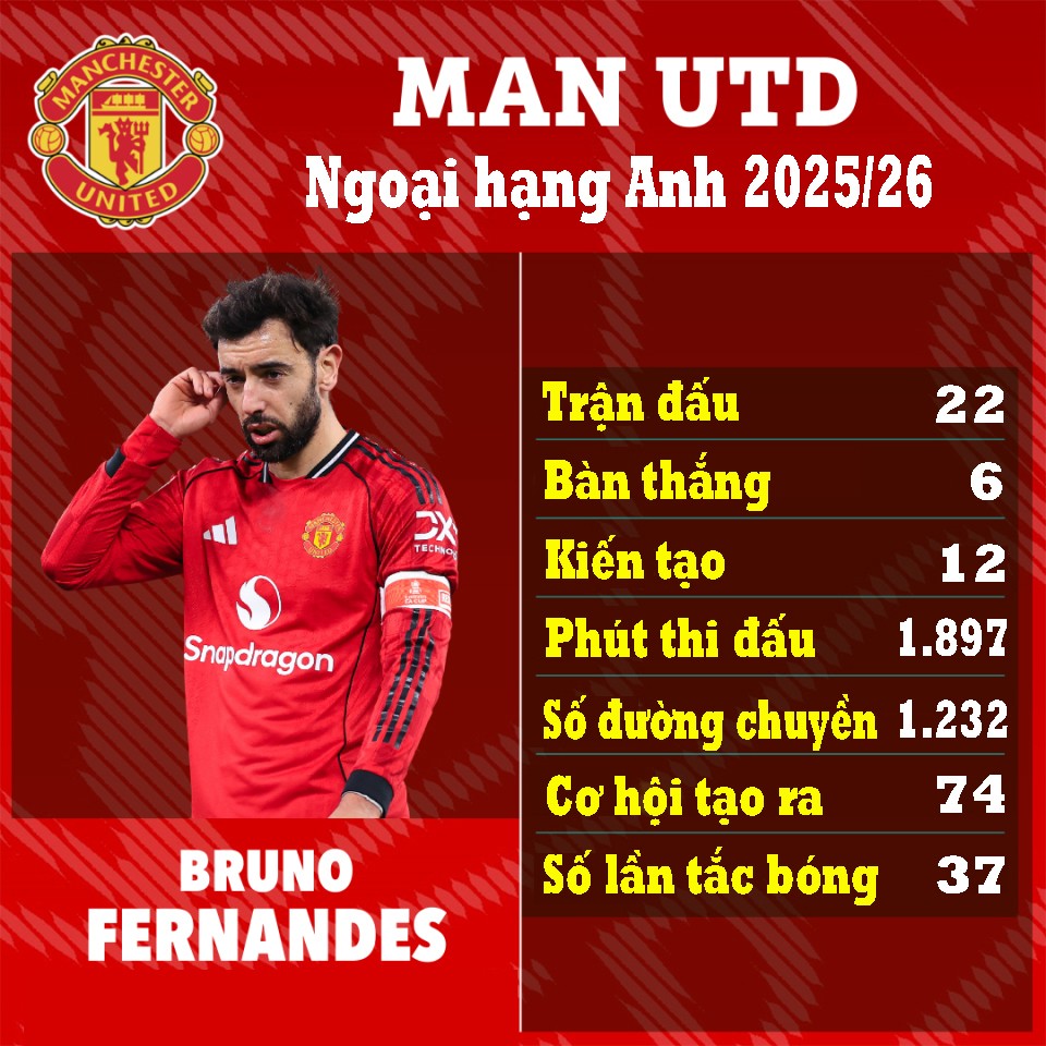 Hiện tại, Bruno đang ở trạng thái sung mãn cả về thể chất lẫn tinh thần. Anh không chỉ ghi bàn và kiến tạo, mà còn đóng vai trò kết nối, truyền cảm hứng và dẫn dắt lối chơi. Những pha phối hợp nhanh, những đợt lên bóng mạch lạc của "Quỷ đỏ" đều có “dấu vân tay” của đội trưởng người Bồ Đào Nha.