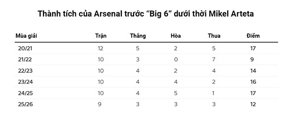 Arsenal hiện giành 12 điểm trước nhóm “Big 6”, và chỉ còn Man City là đối thủ lớn chưa gặp. Trong khi đó, 33 nhà vô địch Ngoại hạng Anh trong quá khứ trung bình kiếm được 18 điểm từ các đối thủ cạnh tranh trực tiếp. Trong 5 mùa giải trọn vẹn dưới thời Arteta, Arsenal chưa lần nào chạm mốc này.