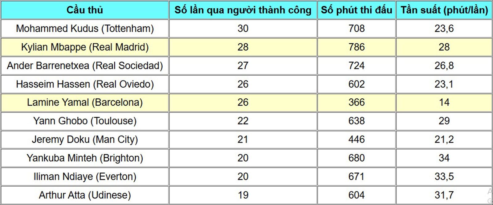 Nhưng số phút thi đấu của Yamal lại là thấp nhất trong 5 cầu thủ đó vì anh đã nghỉ một số trận do chấn thương, nếu tính top 15 thì anh cũng là cầu thủ có số phút ít nhấ. Do đó thay vì tính tổng số, khi chia tần suất thì Yamal mới đang là cầu thủ có tỷ lệ qua người thành công thường xuyên nhất.