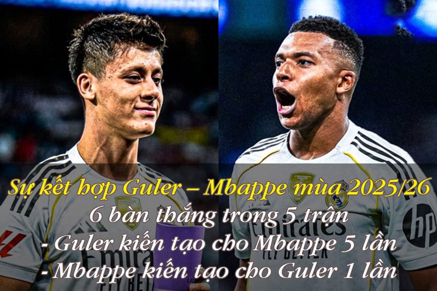 Nhưng đó mới chỉ là công thức để Real Madrid tấn công dễ hơn, vậy còn phong độ ghi bàn của Mbappe vì sao tốt như vậy? Việc mùa này Xabi Alonso tin dùng Arda Guler đã tạo ra một sự kết hợp cực kỳ ăn ý: đã có 6 bàn thắng trong 5 trận mùa này của Real Madrid được tạo nhờ sự phối hợp giữa bộ đôi Guler – Mbappe. Tổng cộng họ đã kết hợp với nhau để làm nên 9 bàn thắng từ khi khoác áo Real Madrid.