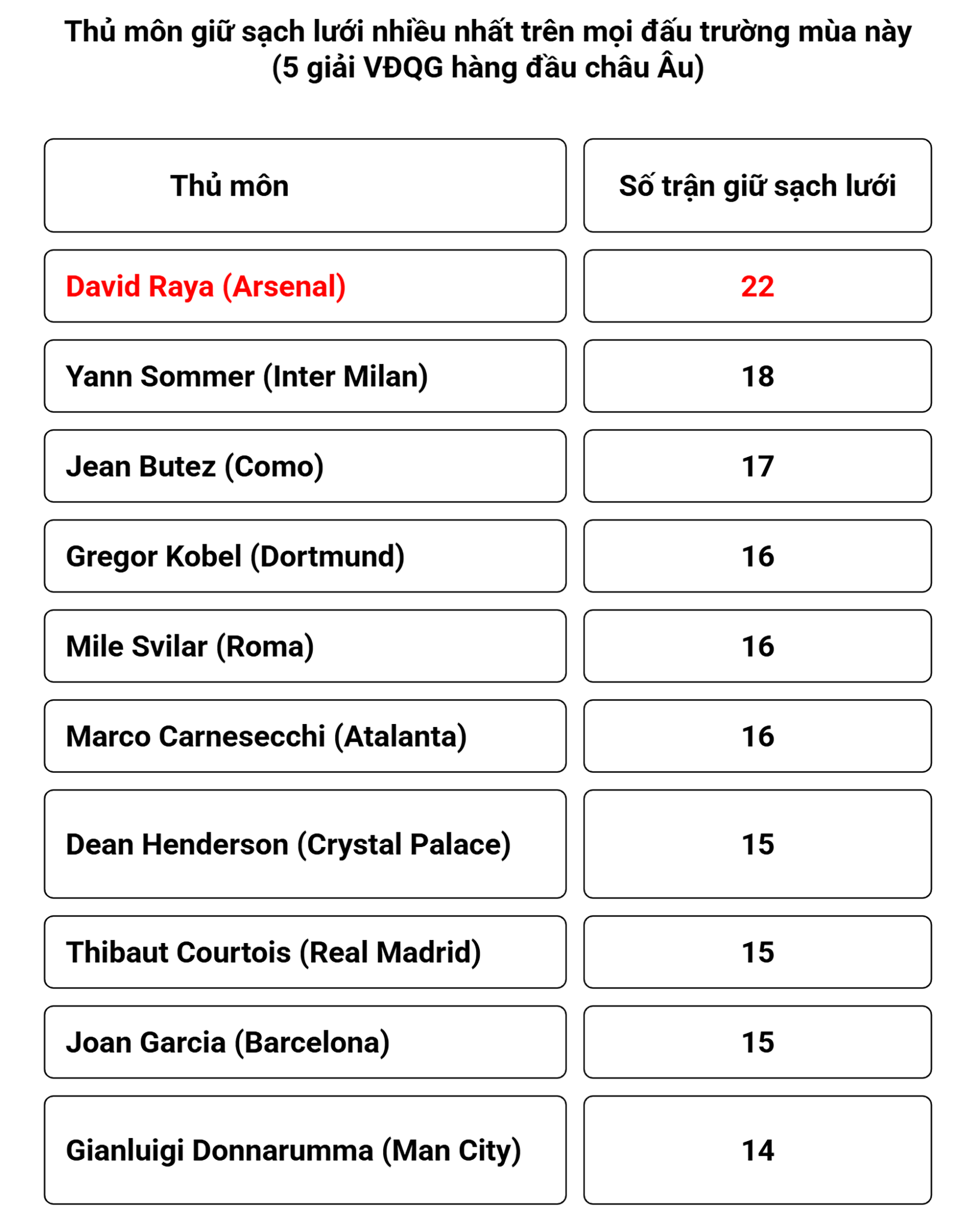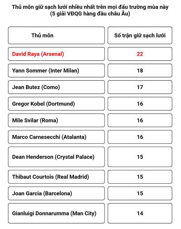 Raya cũng đang là thủ môn giữ sạch lưới nhiều nhất trong 5 giải VĐQG hàng đầu châu Âu mùa này, với 22 trận trên mọi đấu trường. Ở Ngoại hạng Anh, Raya vẫn duy trì phong độ ấn tượng khi dẫn đầu số trận giữ sạch lưới mùa này (15 trận), đồng thời chỉ mắc đúng một sai lầm dẫn đến bàn thua trong 69 lần ra sân ở hai mùa gần nhất.