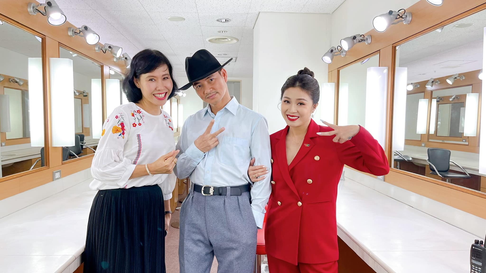 Nữ BTV chụp hình cùng NSƯT Xuân Bắc và MC Hoàng Linh ở hậu trường ghi hình