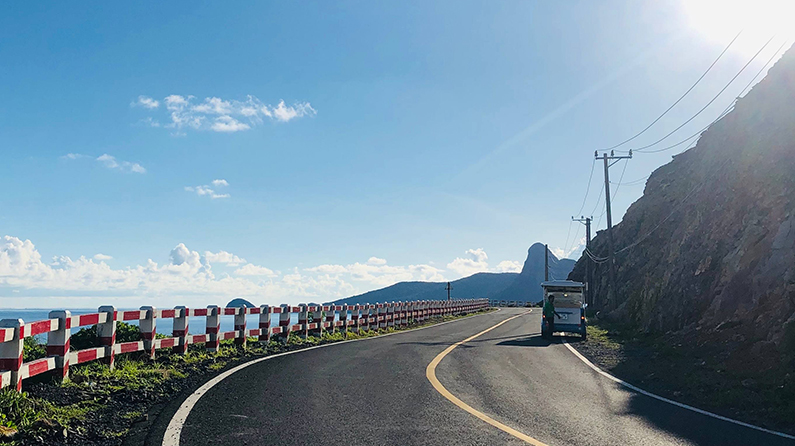 Có đoạn đường nối ra biển, một bên là núi cao xanh ngát, một bên là biển nước xanh thẳm, mênh mông. Điểm nhấn trên đoạn đường này chính là những rào ngăn cách sơn màu trắng đỏ bắt mắt.
