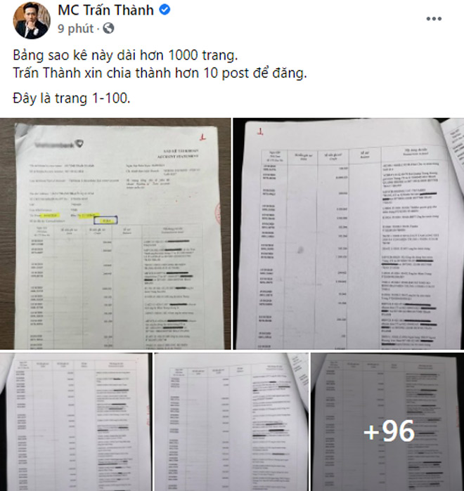 Ngay lập tức, status này đã nhận được tương tác “khủng” từ cộng đồng mạng. Chỉ trong vòng hơn 40 phút đã nhận về gần 250 nghìn lượt like. Nam MC chia sẻ hình ảnh chụp 100 trang sao kê cùng lời chú thích ngắn gọn súc tích: “Bảng sao kê này dài hơn 1000 trang. Trấn Thành xin chia thành hơn 10 post để đăng. Đây là trang 1-100.”