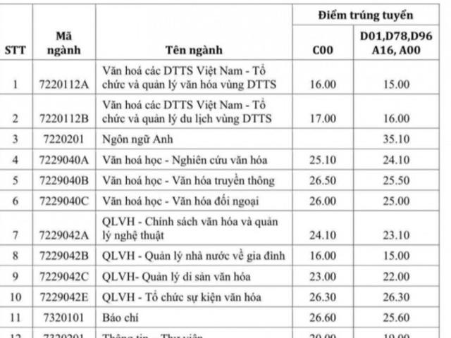 Ngày 16/9, Học viện Công nghệ Bưu chính Viễn thông và Đại học Văn hóa thông báo điểm chuẩn trúng tuyển năm 2021, trong đó ĐH Văn hóa Hà Nội lấy điểm chuẩn cao nhất là 35,1.