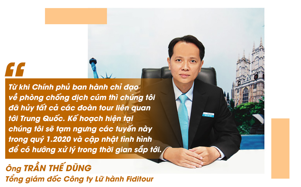 Ông Trần Thế Dũng, Tổng giám đốc Công ty Lữ hành Fiditour chia sẻ với báo chí: "Từ khi Chính phủ ban hành chỉ đạo về phòng chống dịch cúm thì chúng tôi đã hủy tất cả các đoàn tour liên quan tới Trung Quốc. Kế hoạch hiện tại chúng tôi sẽ tạm ngưng các tuyến này trong quý 1.2020 và cập nhật tình hình để có hướng xử lý trong thời gian sắp tới".