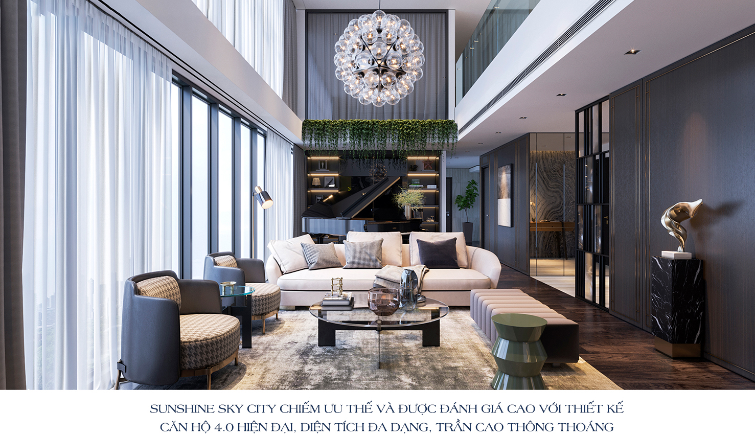 Bộ sưu tập những căn hộ cao cấp của Sunshine Sky City nổi bật với thiết kế tối ưu, diện tích căn đa dạng, trần cao, nhiều mặt thoáng để đảm bảo căn hộ luôn lộng gió. Điều đặc biệt, 100% căn hộ bắt trọn ánh sáng theo phương ngang. Hệ thống kính Low-E hiện đại, sang trọng còn đảm nhận “sứ mệnh” cách âm, cách nhiệt, chắn tia UV, để mỗi cư dân có thể hưởng thụ cuộc sống bình yên, tránh xa những ồn ào của phố thị. Đêm xuống, những tòa tháp càng lộng lẫy hơn khi dự án được phủ kính từ trần xuống sàn cộng hưởng với ánh đèn, mang đến diện mạo như khách sạn 5* lung linh giữa bầu trời thành phố.