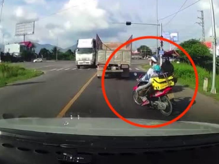 Clip: Tài xế cùng xe máy lao vào gầm xe tải như trong phim, may mắn thoát đại nạn