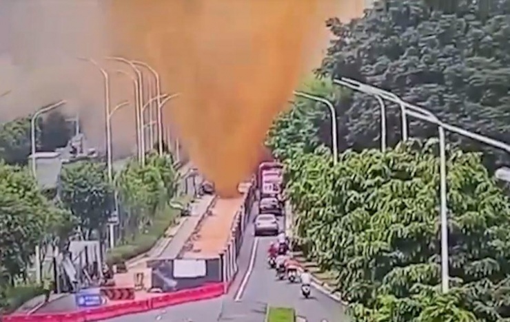 Những cảnh quay ghi lại được cho thấy, sau khi đường ống bị vỡ, chất thải phun cao hơn 10 mét rồi bắn tung tóe vào người đi xe máy. Một lượng lớn nước thải cũng rơi xuống kính chắn gió của những chiếc ô tô đang di chuyển.