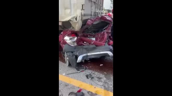Lực lượng cứu hộ cắt xe, phá cửa kính cứu ba người mắc kẹt trong ôtô 5 chỗ bị vò nát dưới gầm xe container, sau tai nạn liên hoàn, sáng 12/1.