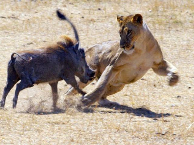 Phát hiện thấy lợn rừng đang mải kiếm ăn từ đằng xa, đàn sư tử đói nhẹ nhàng tiến lại gần sau đó tăng tốc vồ lấy con mồi.