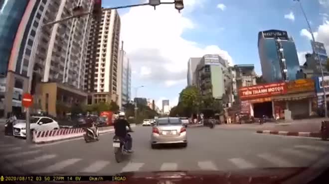 Sau cú tông mạnh, cả 2 văng xuống đường. Tuy nhiên, khi vừa thấy tài xế ô tô xuống xe để xem xét tình hình, nam thanh niên cầm lái đã vội vàng vứt xe máy lại rồi bỏ chạy. Thấy vậy, một người đi đường đã lập tức đuổi theo và chặn nam thanh niên này lại. Trong khi đó, nam thanh niên ngồi sau có vẻ đau đớn, một lúc sau mới đứng dậy được.