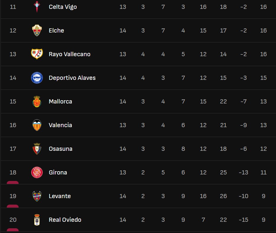 Ở đáy bảng, tình hình không có nhiều thay đổi. Levante và Real Oviedo tiếp tục đứng ở hai vị trí nguy hiểm nhất, vẫn loay hoay tìm đường thoát khỏi vùng tối với những con số khiêm tốn về bàn thắng lẫn điểm số. Girona — đội đứng thứ 18 — cũng không có quá nhiều hy vọng khi phía trước họ là thử thách khổng lồ mang tên Real Madrid. Một thất bại nữa rất có thể đẩy họ vào tình trạng báo động đỏ. Các đội như Valencia, Mallorca hay Osasuna cũng phải hết sức thận trọng, bởi chỉ cần một chuỗi trận tệ, họ hoàn toàn có thể bị cuốn vào vòng xoáy trụ hạng.