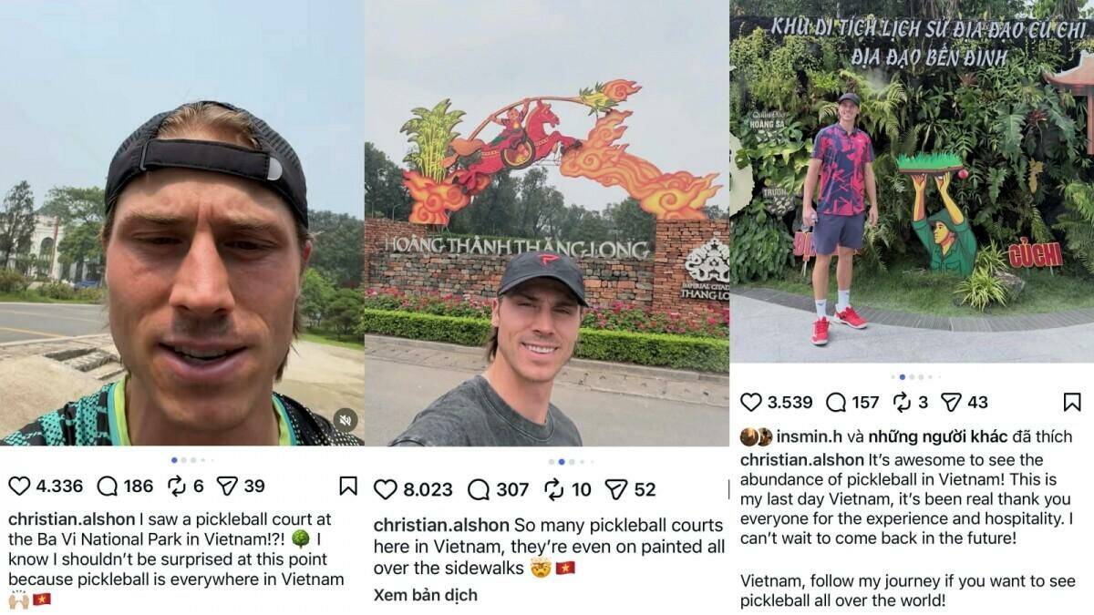 Các bài đăng của Christian Alshon nhận được lượng tương tác lớn, đặc biệt từ cộng đồng người hâm mộ pickleball Việt Nam. Tay vợt vừa giành huy chương bạc nội dung đôi nam nữ tại PPA Asia 1000 - Hanoi Cup 2026 cho biết anh bị cuốn hút bởi trải nghiệm khám phá Việt Nam. Trước khi rời “mảnh đất hình chữ S”, Alshon gửi lời cảm ơn: “Thật tuyệt khi được chứng kiến sự đa dạng của pickleball ở Việt Nam. Trước khi rời Việt Nam, tôi muốn gửi lời cảm ơn tới tất cả mọi người vì lòng hiếu khách và trải nghiệm ở nơi đây. Tôi rất háo hức được trở lại Việt Nam trong tương lai!”.