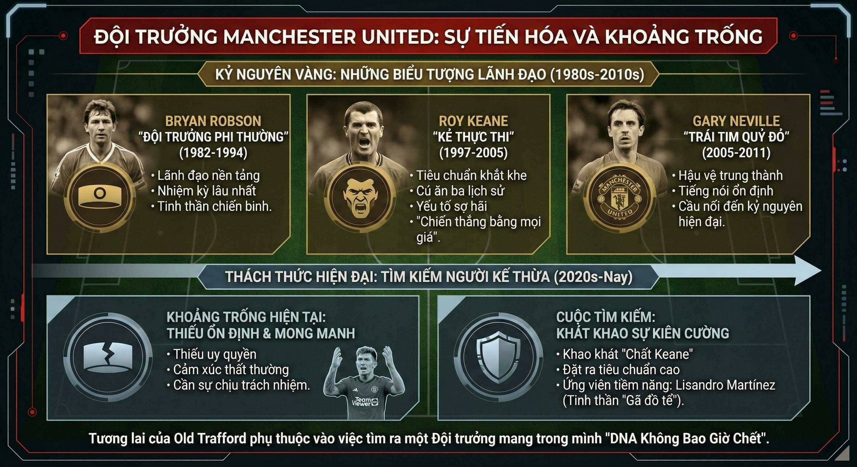 Sau sự ra đi đầy dông bão của Keane, Gary Neville đã tiếp quản chiếc băng đội trưởng theo một cách rất khác. Neville chưa bao giờ là cầu thủ giỏi nhất, nhưng anh là người yêu MU nhất. Anh đại diện cho tiếng nói của cổ động viên, cho lòng trung thành và sự thấu hiểu sâu sắc giá trị truyền thống CLB. Neville lãnh đạo bằng sự ổn định và là chỗ dựa tinh thần để những ngôi sao tấn công như Ronaldo hay Rooney tỏa sáng. Anh chứng minh rằng, bạn không cần phải là siêu sao để làm thủ lĩnh, miễn là dòng máu trong người bạn đủ "đỏ".