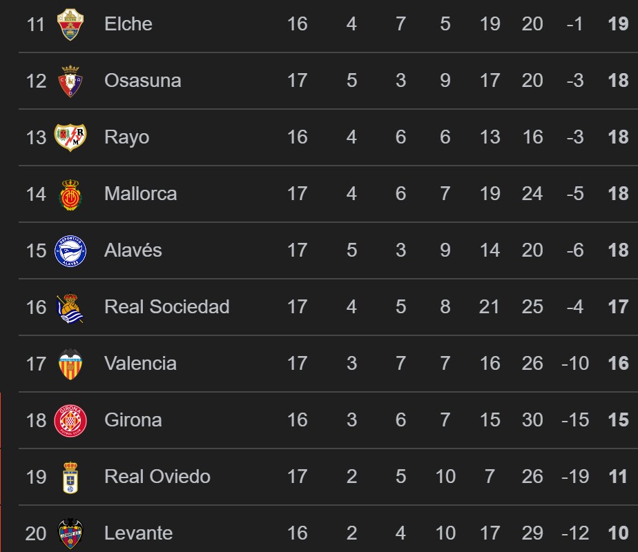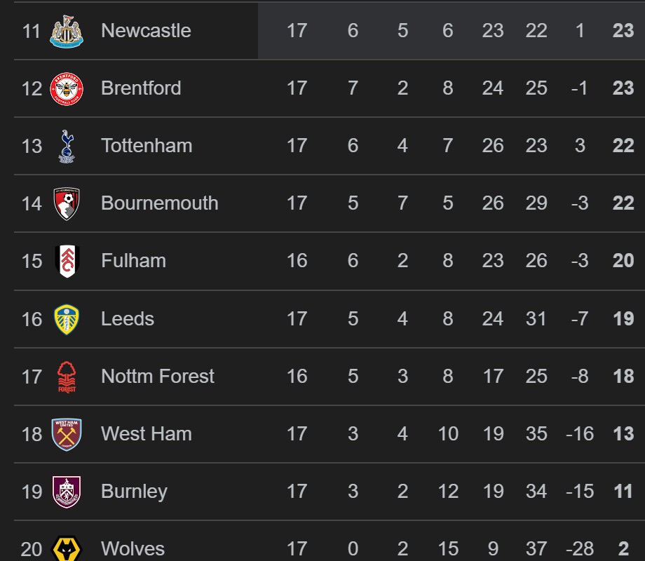 Ở đáy bảng, Wolves tiếp tục chìm sâu khi thua Brentford 0-2 và vẫn chỉ có vỏn vẹn 2 điểm sau 17 vòng đấu. Khoảng cách với nhóm an toàn đã trở nên gần như không thể san lấp. Burnley giành được một điểm quý giá trước Bournemouth để duy trì hy vọng mong manh, trong khi West Ham ngày càng lún sâu sau thất bại trước Man City. Điểm sáng lớn nhất thuộc về Leeds United. Chiến thắng 4-1 trước Crystal Palace không chỉ mang về ba điểm, mà còn giúp họ bứt ra khỏi vùng nguy hiểm và tạo cú hích tinh thần cực lớn cho chặng đường phía trước.