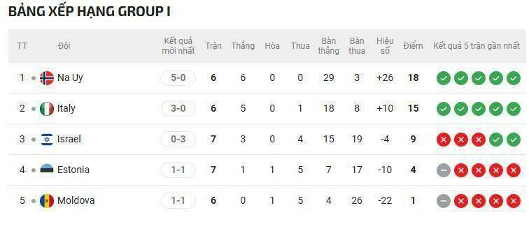 Tại bảng I, Italia vừa có chiến thắng quan trọng 3-0 trước Israel để củng cố vị trí nhì bảng. Retegui lập cú đúp, còn trung vệ Mancini ghi bàn ấn định ở phút bù giờ, giúp đoàn quân áo Thiên thanh tạm thời thu hẹp khoảng cách với Na Uy xuống còn 3 điểm trên bảng xếp hạng. Trước đó, Na Uy cũng thắng đậm Israel 5-0 nhờ hat-trick của Erling Haaland, tiếp tục giữ thành tích toàn thắng 6 trận, giành 18 điểm tuyệt đối. Italia đứng ngay sau với 15 điểm, trong khi Israel (9 điểm) và các đội Estonia, Moldova chỉ còn thi đấu vì danh dự. Hai lượt cuối tháng 11 sẽ là thời điểm định đoạt ngôi đầu: nếu Na Uy thắng Estonia, họ sẽ chắc suất đến World Cup 2026 với ngôi đầu bảng. Ngược lại, nếu Italia đánh bại Moldova và quật ngã chính Na Uy ở lượt cuối, tình hình có thể đảo chiều. Dù vậy, với hiệu số bàn thắng vượt trội và phong độ hủy diệt, Haaland cùng đồng đội vẫn được đánh giá có cơ hội giành vé trực tiếp hơn đội tuyển từng 4 lần vô địch thế giới.