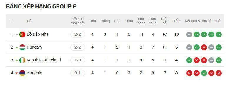 Ở bảng F, cuộc cạnh tranh vẫn rất gay cấn khi Bồ Đào Nha bị Hungary cầm hòa 2-2 tại Lisbon. Ronaldo lập cú đúp từ những pha đệm bóng cận thành, nhưng Dominik Szoboszlai tỏa sáng ở phút cuối để mang về 1 điểm quý giá cho Hungary. Trong trận còn lại, Ireland đánh bại Armenia 1-0 để níu giữ hy vọng. Sau 4 lượt đấu, Bồ Đào Nha dẫn đầu với 10 điểm, Hungary xếp sau với 5, Ireland có 4 và Armenia chỉ có 3. Kết quả này khiến bảng F vẫn “mở toang” trước hai lượt cuối. Ronaldo và đồng đội chỉ cần thêm một chiến thắng để giữ ngôi đầu, nhưng nếu Hungary toàn thắng ở 2 trận đấu còn lại, mọi chuyện có thể đảo chiều. Trong khi đó, Ireland vẫn nuôi cơ hội nhỏ có vé dự vòng play-off nếu cả hai đối thủ chính là Bồ Đào Nha và Hungary đồng loạt cùng mất điểm ở loạt trận diễn ra vào tháng tới.