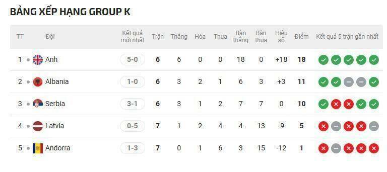 Trong khi đó, bảng K gần như đã an bài khi tuyển Anh chính thức trở thành đội châu Âu đầu tiên giành vé dự World Cup 2026. Đoàn quân của HLV Thomas Tuchel vừa vùi dập Latvia 5-0 trên sân khách với các pha lập công của Gordon, Eze và cú đúp của Harry Kane. Sau 6 lượt trận, Anh toàn thắng, ghi 18 bàn và chưa để lọt lưới, dẫn đầu bảng với 18 điểm tuyệt đối. Ở phía sau, Albania đứng nhì với 11 điểm, Serbia bám sát với 10 điểm, còn Latvia (5 điểm) và Andorra (1 điểm) đã bị bỏ lại phía sau. Tháng 11 tới, Anh sẽ tiếp Serbia trên sân Wembley rồi làm khách của Albania. Dù đã chắc ngôi đầu, “Tam Sư” vẫn hướng đến vòng loại hoàn hảo với 8 trận toàn thắng và thành tích sạch lưới.Tâm điểm của bảng đấu giờ đây sẽ được hướng về cuộc đua cho tấm vé play-off tranh suất đến World Cup. Nếu Serbia thắng cả hai trận tiếp theo, họ sẽ vượt qua Albania; còn nếu Albania giành điểm trước Anh, 100% tấm vé đá play-off sẽ thuộc về đội bóng này.