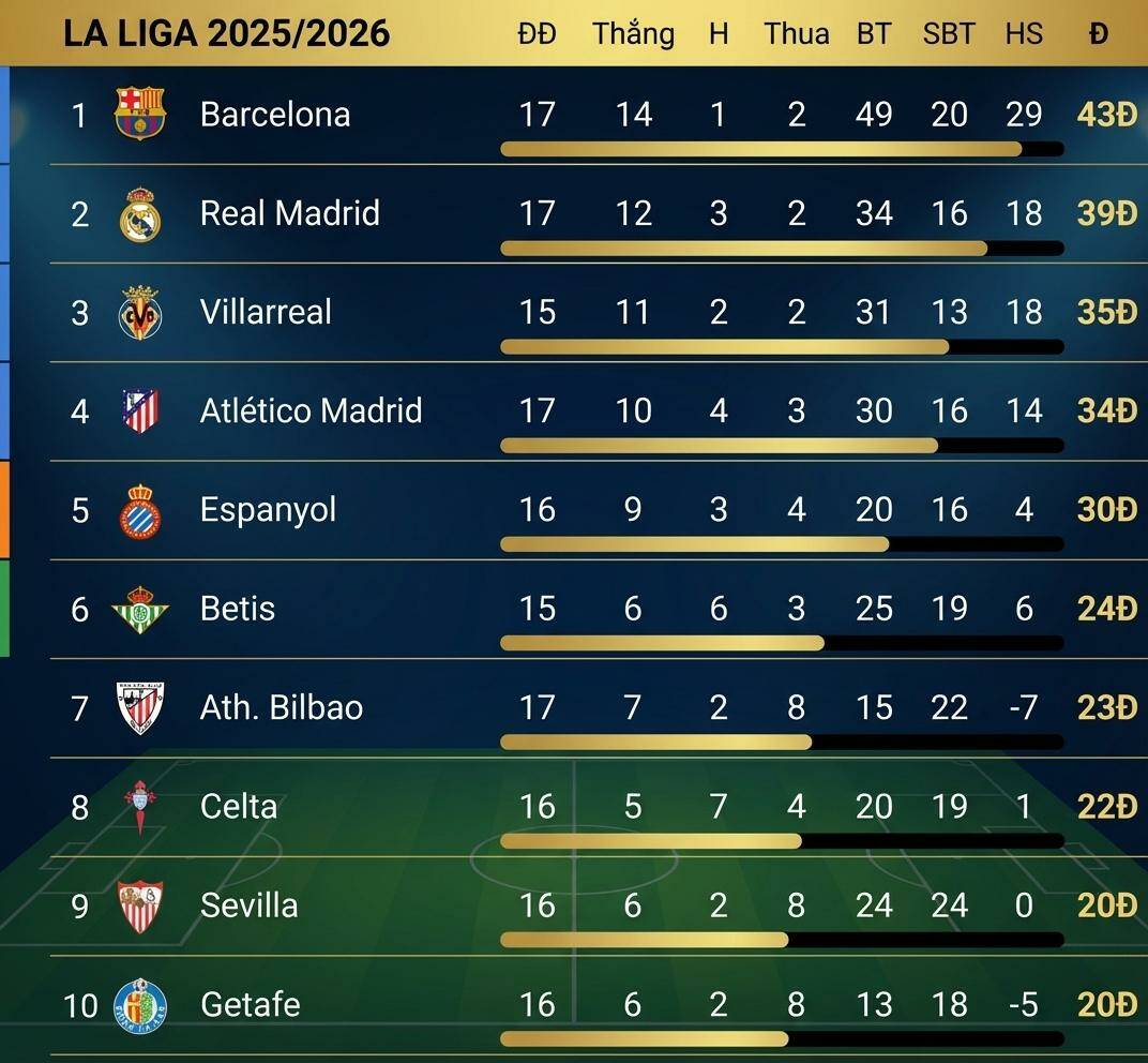 Vòng đấu vừa qua không tạo ra cú sốc lớn, nhưng đủ để làm rõ xu hướng: Barcelona vẫn là người dẫn đường, Real Madrid cố gắng níu kéo, Villarreal còn ẩn số chưa mở, còn nhóm giữa và cuối bảng bắt đầu phân hóa rõ rệt. Từ thời điểm này, La Liga không còn chỗ cho sự do dự. Mỗi chiến thắng sẽ mang giá trị kép — vừa là điểm số, vừa là lợi thế tâm lý. Và với Real Madrid, cuộc đua chỉ thực sự bắt đầu nếu họ biến chiến thắng vất vả vừa qua thành bước đệm cho sự hồi sinh bền bỉ hơn.