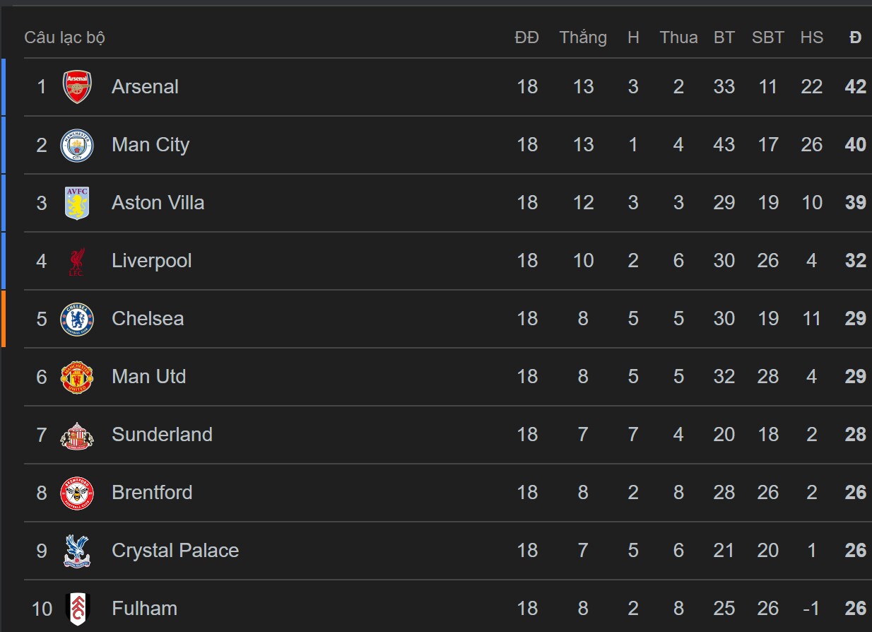 Sau vòng 18, Premier League không còn là cuộc đua mơ hồ của quá nhiều cái tên. Nhóm đầu với Arsenal (42 điểm), Man City (40 điểm) và Aston Villa (39 điểm) đã tách khỏi phần còn lại. Phía sau, Liverpool chiếm vị trí thứ 4, trong khi Chelsea và Man United cùng có 29 điểm, sẵn sàng tăng tốc. Những kết quả như Sunderland hòa Leeds hay Palace thua Tottenham cho thấy ranh giới giữa “ứng viên” và “kẻ theo đuổi” đang hiện ra rõ rệt. Ở giải đấu khắc nghiệt nhất châu Âu, không có chỗ cho sự do dự. Mỗi vòng trôi qua là một phép thử bản lĩnh, và Premier League đang bước vào giai đoạn mà chỉ những đội đủ ổn định, đủ chiều sâu và đủ lạnh lùng mới có quyền tiếp tục nuôi giấc mơ lớn.
