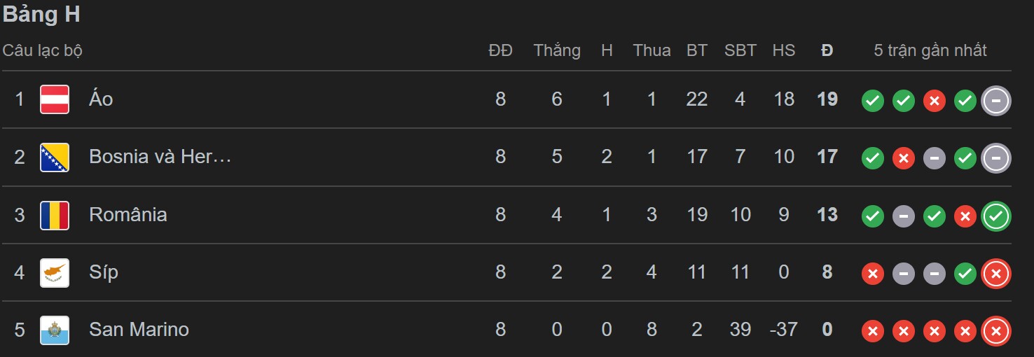 Áo hòa Bosnia 1-1 để giữ ngôi đầu với 19 điểm, chính thức ghi tên mình vào World Cup 2026. Bosnia đứng nhì bảng với 17 điểm, dù không thắng nhưng vẫn chắc suất play-off. Romania hủy diệt San Marino 7-0 và cán đích với 13 điểm nhưng vẫn đứng thứ ba – một sự tiếc nuối khó tránh khi họ đã chiến đấu kiên cường. Síp kết thúc với 8 điểm, còn San Marino thì không quá bất ngờ khi họ trắng tay toàn bộ chiến dịch.