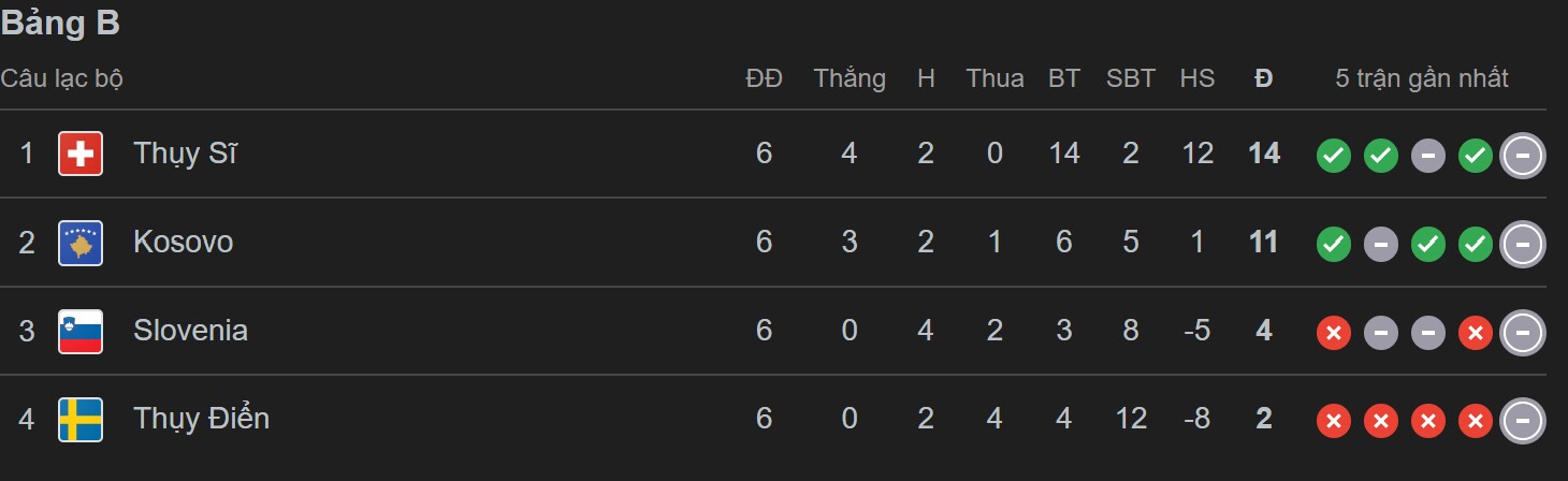 Trận hòa 1-1 trên sân Kosovo là đủ để Thụy Sĩ bảo toàn ngôi đầu bảng với 14 điểm, qua đó chính thức giành vé dự World Cup 2026. Họ không chơi quá bùng nổ ở lượt cuối, nhưng sự ổn định trong suốt hành trình giúp đội bóng vượt trội so với phần còn lại. Kosovo, dù không thể tạo nên cú lật đổ, vẫn đứng nhì bảng với 11 điểm và bước vào vòng play-off với tâm thế tích cực. Slovenia và Thụy Điển hòa nhau 1-1 để khép lại một chiến dịch đáng quên khi lần lượt chỉ có 4 và 2 điểm – bị loại sớm và không thể tạo bất kỳ dấu ấn nào.