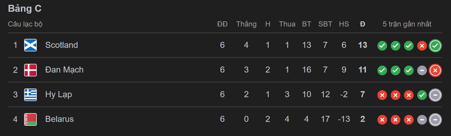 Scotland tạo nên một đêm đáng nhớ khi thắng Đan Mạch 4-2 trong trận đấu điên rồ với 2 bàn thắng ở phút bù giờ. Kết quả ấy đưa họ lên 13 điểm, đứng đầu bảng và giành tấm vé trực tiếp đến World Cup sau 27 năm. Đan Mạch, từ vị thế ứng viên số một, trượt xuống nhì bảng với 11 điểm và buộc phải đá play-off. Hy Lạp hòa Belarus 0-0 nhưng với chỉ 7 điểm, họ không thể chen chân vào cuộc đua. Belarus kết thúc ở đáy bảng với 2 điểm, khép lại chiến dịch bằng nỗi thất vọng quen thuộc.