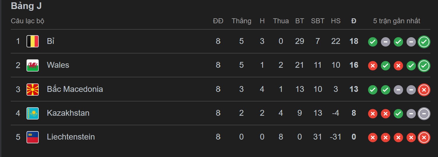 Bỉ nghiền nát Liechtenstein 7-0 để khẳng định vị thế số một với 18 điểm, trở thành đội đầu tiên của bảng chắc suất dự World Cup. Wales cũng thắng hủy diệt 7-1 trước Bắc Macedonia, giữ vững vị trí nhì bảng với 16 điểm và bước vào vòng play-off. Bắc Macedonia đứng thứ ba với 13 điểm, còn Kazakhstan (8 điểm) và Liechtenstein (0 điểm) khép lại vòng loại mà không còn cơ hội.