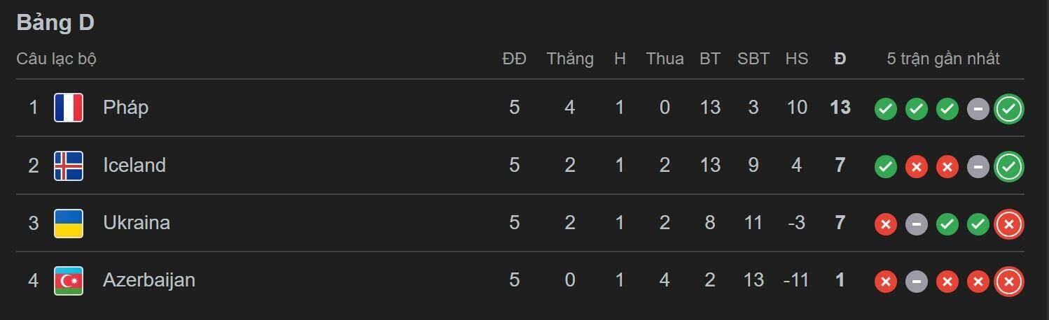Đêm bóng đá châu Âu mở màn bằng màn trình diễn thuyết phục của tuyển Pháp khi đè bẹp Ukraine 4-0. Mbappé rực sáng với cú đúp, đồng thời chạm mốc 400 bàn trong sự nghiệp, một dấu mốc chỉ những siêu sao vĩ đại mới có thể đạt được. Chiến thắng giúp Les Bleus nâng thành tích lên 13 điểm sau 5 trận, chính thức giành vé tham dự World Cup 2026 sớm trước hai lượt đấu. Ở trận còn lại, Iceland vượt qua Azerbaijan 2-0 để vươn lên hạng 2 với 7 điểm, bằng điểm Ukraine nhưng xếp trên nhờ hiệu số. Azerbaijan tiếp tục đứng cuối bảng với 1 điểm, gần như không còn hy vọng.