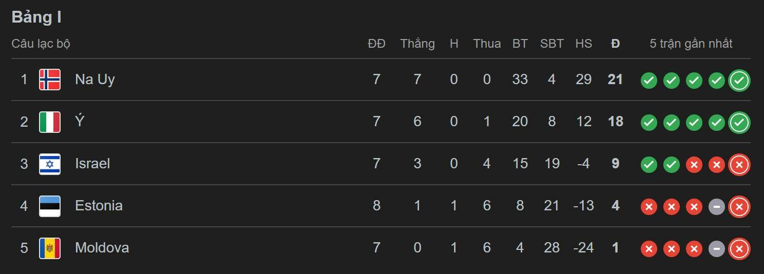 Na Uy tiếp tục hành trình thuyết phục với thắng lợi 4-1 trước Estonia, giữ thành tích toàn thắng 7 trận, sở hữu 21 điểm, gần như chạm tay vào tấm vé trực tiếp tới kỳ World Cup trên đất Mỹ – Canada – Mexico. Italia, dù gặp khó khăn hơn dự kiến, vẫn kịp đánh bại Moldova 2-0 để giữ vị trí nhì bảng với 18 điểm và tiếp tục nuôi hy vọng đua tranh. Ở phía sau, Israel (9 điểm), Estonia (4 điểm) và Moldova (1 điểm) gần như chỉ còn mục tiêu phấn đấu cho suất play-off, bởi khoảng cách với nhóm dẫn đầu đã quá xa.