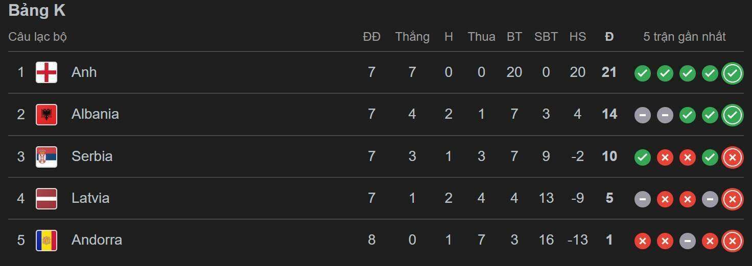 Tuyển Anh của HLV Thomas Tuchel tiếp tục chuỗi trận hoàn hảo bằng chiến thắng 2-0 trước Serbia, qua đó nâng điểm số lên 21 điểm, chính thức giành vé dự World Cup 2026 với phong độ không thể cản phá. Albania cũng hoàn thành nhiệm vụ với thắng lợi 2-0 trước Andorra, giữ chắc hạng 2 với 14 điểm, tạo đà thuận lợi trong cuộc đua giành suất play-off. Serbia xếp hạng 3 với 10 điểm, còn Latvia (5 điểm) và Andorra (1 điểm) ngày càng xa rời cuộc cạnh tranh.