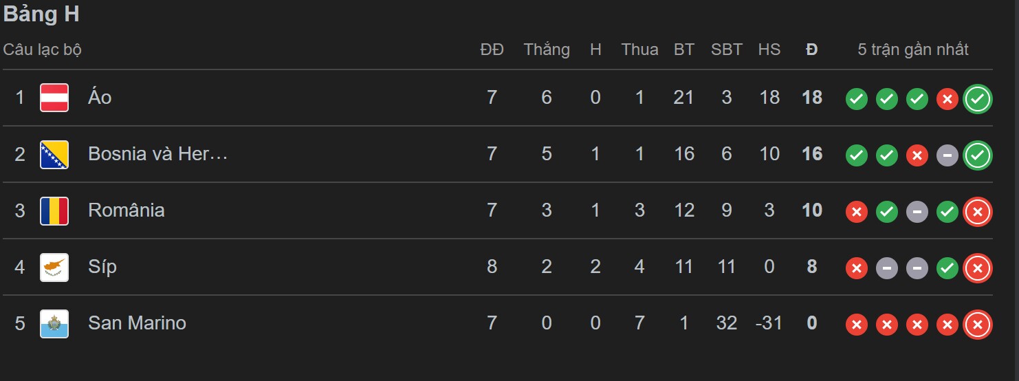 Áo tiếp tục hành trình ấn tượng bằng thắng lợi 2-0 trước Síp để duy trì ngôi đầu với 18 điểm. Họ cho thấy sự cân bằng giữa chắc chắn và hiệu quả – yếu tố của một đội bóng đã gần như chạm tay vào vé trực tiếp. Bosnia & Herzegovina, với chiến thắng 3-1 trước Romania, nâng điểm số lên 16 và trở thành kẻ bám đuổi nguy hiểm nhất. Romania (10 điểm) bắt đầu hụt hơi, còn Síp (8 điểm) và San Marino (0 điểm) chỉ còn đóng vai phụ trong một cuộc đua đang tăng tốc.