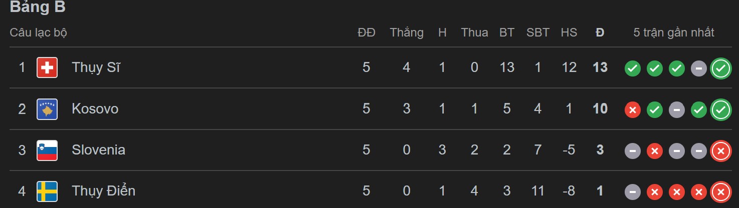 Loạt trận đêm qua biến bảng B thành sân khấu của hai kẻ mạnh mẽ nhất: Thụy Sĩ và Kosovo. Chiến thắng 4-1 trước Thụy Điển không chỉ giúp Thụy Sĩ nâng điểm số lên 13 mà còn tái khẳng định sự vượt trội ở cả hiệu quả lẫn bản lĩnh trận mạc. Họ đang tiến những bước rất chắc tới tấm vé trực tiếp. Ở chiều ngược lại, Kosovo đánh bại Slovenia 2-0 theo cách thuyết phục. Với 10 điểm, họ không chỉ giữ vững vị trí nhì bảng mà còn tạo sức ép đủ lớn khiến Thụy Sĩ buộc phải cẩn trọng trong lượt cuối. Trong khi đó, Slovenia (3 điểm) và Thụy Điển (1 điểm) tiếp tục sa lầy, gần như rời khỏi cuộc đua. Tất cả giờ dồn vào trận Thụy Sĩ – Kosovo, nơi một sai lầm có thể đảo chiều cả bảng đấu.