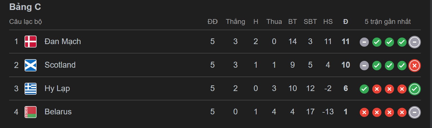 Đan Mạch bước vào vòng đấu này với sự tự tin, nhưng trận hòa 2-2 trước Belarus lại khiến họ đánh mất nhịp điệu. Dù vẫn dẫn đầu với 11 điểm, khoảng cách mong manh khiến họ chịu áp lực khổng lồ. Scotland trải qua đêm tồi tệ hơn khi gục ngã 2-3 trước Hy Lạp, bỏ lỡ cơ hội vàng để vươn lên. Họ vẫn giữ 10 điểm nhưng đã đánh mất sự chủ động. Hy Lạp – đội bóng bị đánh giá thấp nhất trong nhóm cạnh tranh – bất ngờ thổi bùng lại hy vọng bằng chiến thắng quý hơn vàng. Belarus, với chỉ 1 điểm, đứng ngoài cuộc đua nhưng lại trở thành kẻ phá bĩnh đầy khó chịu. Lượt trận cuối giữa Đan Mạch và Scotland giờ đã trở thành trận đấu định mệnh.
