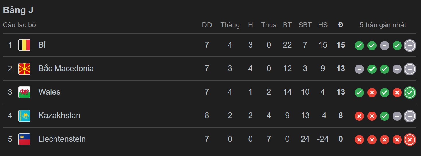 Bỉ bất ngờ khựng lại với trận hòa 1-1 trước Kazakhstan, dù vẫn dẫn đầu với 15 điểm. Đây là cú sảy chân đúng thời điểm khiến áp lực đổ dồn lên họ khi phía sau, Bắc Macedonia và Wales – cùng 13 điểm – đang phả hơi nóng dữ dội. Wales thắng Liechtenstein 1-0 để tiếp tục cuộc đua trong nhóm tam mã cực căng. Kazakhstan (8 điểm) giữ thói quen gây khó, còn Liechtenstein (0 điểm) tiếp tục là đội lót đường. Những gì đang diễn ra ở bảng J báo trước một lượt đấu cuối nghẹt thở, nơi mọi chi tiết nhỏ đều có thể xoay chuyển cục diện.