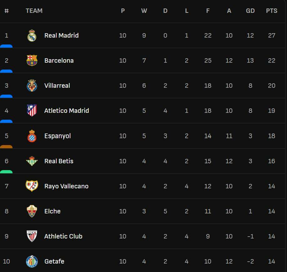 Ở nửa dưới, Mallorca, Las Palmas và Celta Vigo vẫn vật lộn trong nhóm trụ hạng với vỏn vẹn 5–6 điểm. Espanyol và Alavés cải thiện đôi chút nhưng chưa an toàn, trong khi Valencia có dấu hiệu hụt hơi sau khởi đầu sáng sủa.
