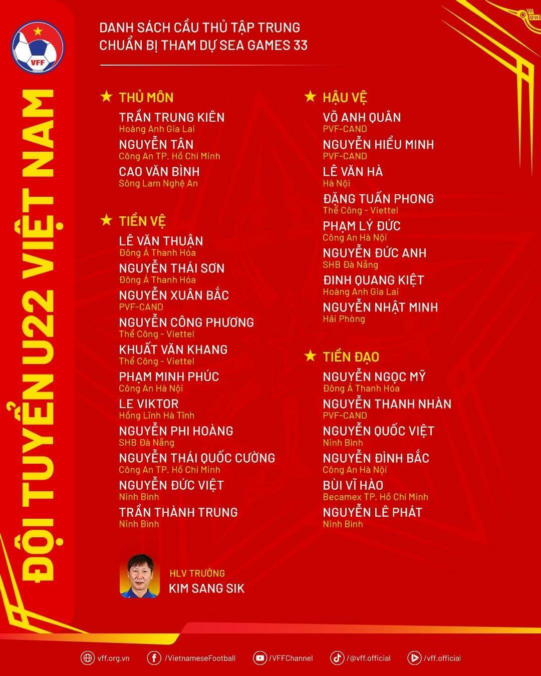 Trong danh sách chính thức chuẩn bị cho SEA Games 33, huấn luyện viên Kim Sang Sik tiếp tục đặt niềm tin vào những gương mặt đã gắn bó với U22 Việt Nam từ đầu năm 2024. Danh sách triệu tập không có nhiều xáo trộn, với sự góp mặt của các cầu thủ như Trung Kiên, Nguyễn Hiểu Minh, Nguyễn Nhật Minh, Phạm Lý Đức, Nguyễn Phi Hoàng, Võ Anh Quân, Khuất Văn Khang, Nguyễn Xuân Bắc, Nguyễn Thái Sơn, Viktor Lê, Nguyễn Thanh Nhàn, Nguyễn Quốc Việt, Lê Văn Thuận và Nguyễn Đình Bắc. Sự ổn định này là nền tảng giúp đội tuyển gặt hái thành công, như chức vô địch U23 Đông Nam Á 2025 và tấm vé dự VCK U23 châu Á 2026.