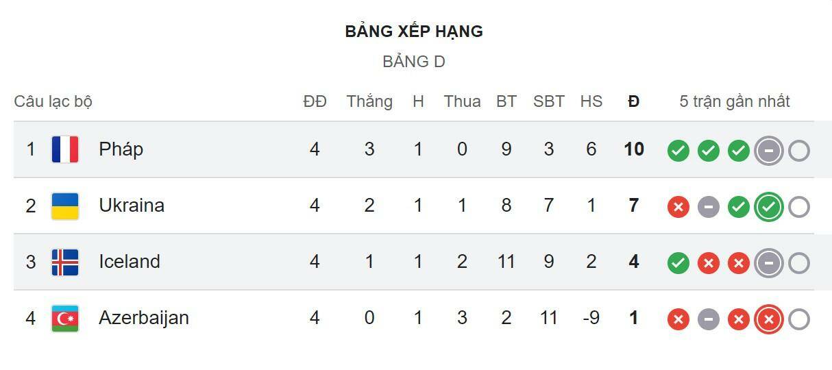 Trong ngày vắng Kylian Mbappe, Pháp bị Iceland cầm chân 2-2 dù hai lần dẫn trước. Ở trận còn lại, Ukraine thắng 2-1 Azerbaijan để chỉ còn kém ngôi đầu ba điểm. Pháp vẫn nắm quyền tự quyết, nhưng trận đối đầu sắp tới với Ukraine sẽ là bước ngoặt then chốt cho tấm vé trực tiếp đến World Cup.