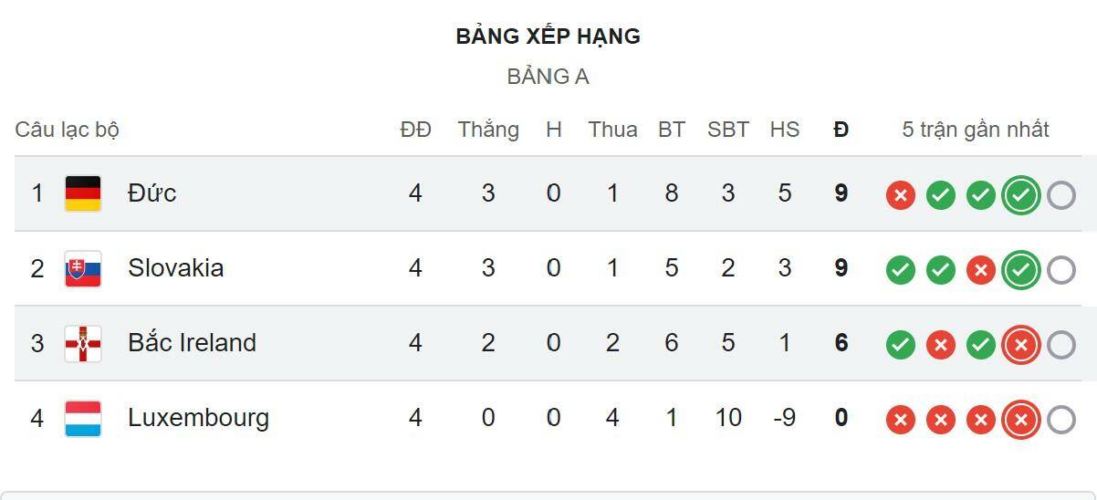 Đức giành chiến thắng 1-0 trên sân Bắc Ireland nhờ pha lập công của Nick Woltemade, qua đó vươn lên dẫn đầu bảng. Slovakia trước đó thắng 2-0 Luxembourg để bám sát, trong khi Bắc Ireland vẫn còn nguyên cơ hội cạnh tranh. Cả ba đội đều có 6 điểm, khiến cục diện bảng A trở nên khó lường. Luxembourg vẫn trắng tay và gần như đã hết hy vọng.