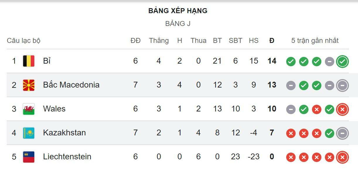 Bỉ thắng 4-2 ngay tại Cardiff nhờ cú đúp của De Bruyne cùng các pha lập công của Meunier và Trossard, qua đó củng cố ngôi đầu bảng J với 14 điểm. Bắc Macedonia hòa 1-1 Kazakhstan, còn Wales tiếp tục sa sút và có nguy cơ mất suất nhì bảng. Liechtenstein gần như đã bị loại.